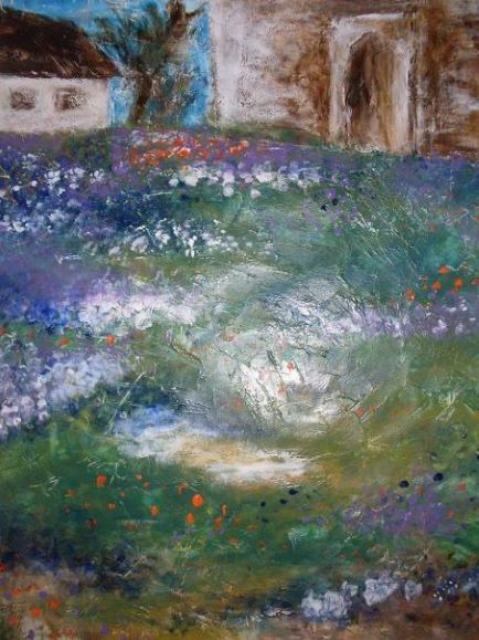 Blumenwiese vor Ruine, Sandra Szepan, Acryl, 2014